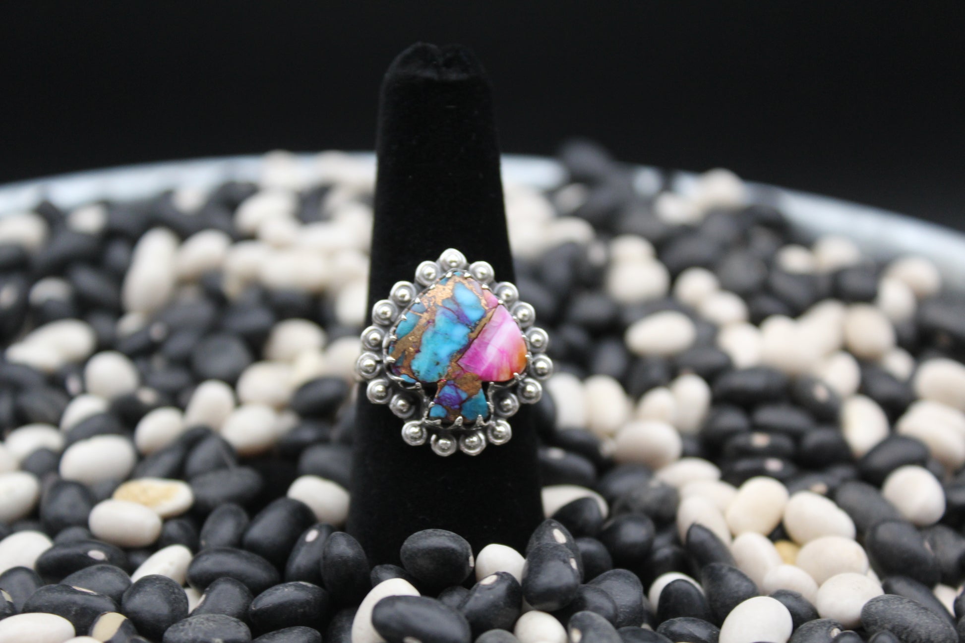 Add a bold and vibrant touch to your collection with this Dahlia spade-shaped ring. The stunning mosaic turquoise stone blends rich hues of turquoise blue, pink, and gold, creating a one-of-a-kind statement piece. Set in sterling silver, the stone is framed by a delicate beaded border, adding texture and charm. The smooth silver band provides a comfortable fit, making this handcrafted Southwestern-style ring both stylish and wearable. Size 7.