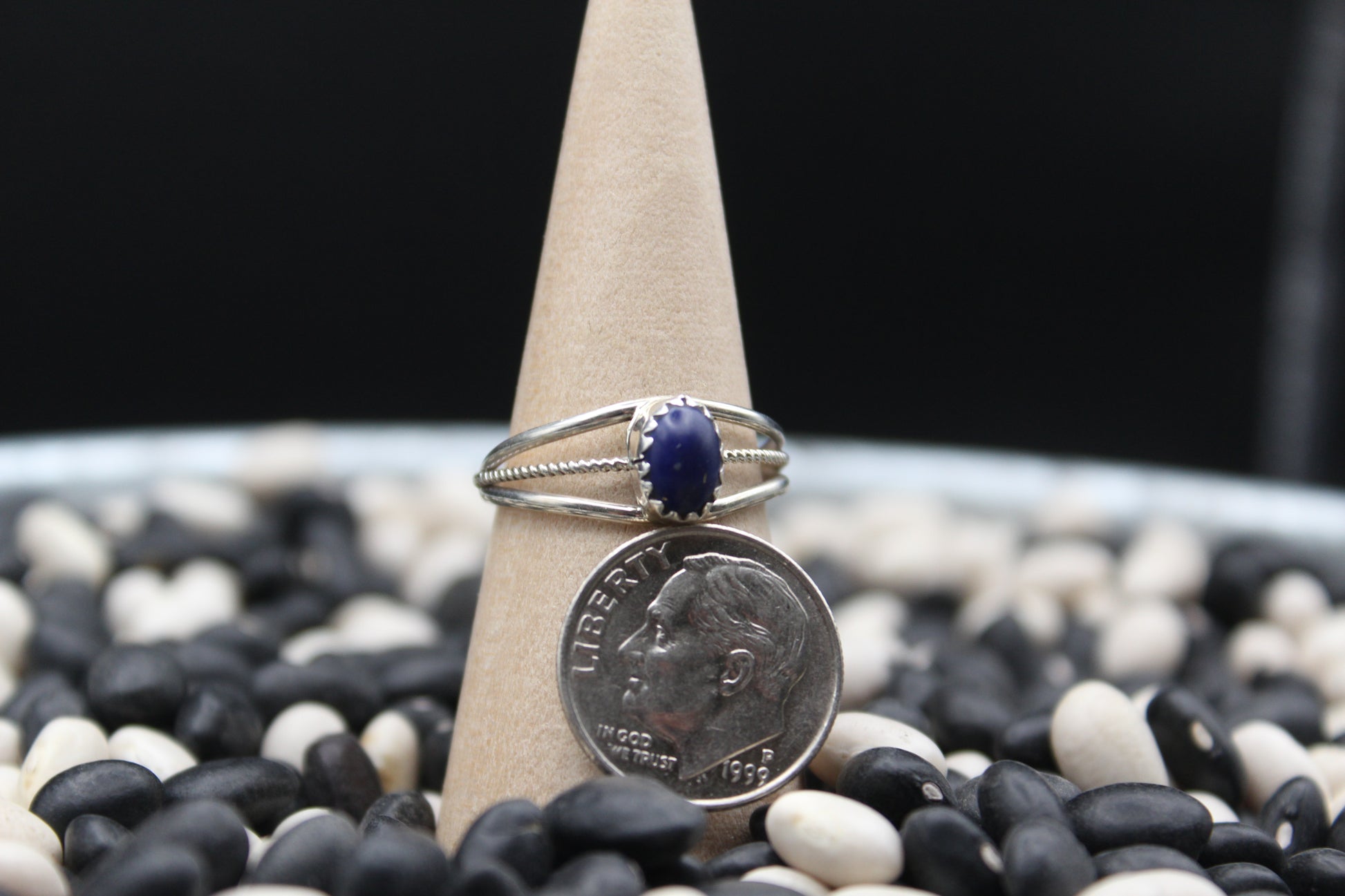 This Native American-made ring features a stunning oval-shaped stone set in a bezel setting with a decorative sawtooth edge. The modern split shank band is a standout feature, with three parallel silver strands—two smooth and one with a textured surface, adding a touch of visual interest and sophistication. This elegant and contemporary design blends traditional craftsmanship with a modern flair, making it a versatile and striking piece
